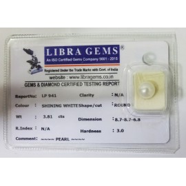 REPORT.NO-LP 941CLARITY-N/ACOLOUR-SHINING WHITESHAPE/CUT-ROUNDWT-3.81 CTSDIMENSION-8.7-8.7-6.8R.INDEX-N/AHARDNESS-3.0COMMENT-PEARL..
