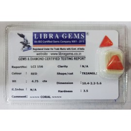 DATE: 11-4-2025REF.NO: LCI  1490NAME: CORALWEIGHT: 3.81 CTSCOLOUR: REDTYPE OF/CUT: TRIANGLEDIMENSION: 1.1-10.8-5.7/CONCLUSION: N/AHARDNESS: 3.5R.INDEX: N/ACLARITY: N/ASPECIFIC COMMENTS: CORAL&nbs..