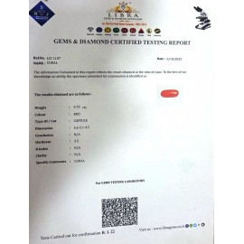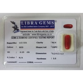 REPORT NO . LCI 321CLARITY . N/ACOLOUR . REDSHAPE / CUT . CAPSULEWT . 4.10 CTSDIMENSION . 5-2.5-5.5-5.R . INDEX . N/AHARDNESS . 3.5COMMENT . CORAL..