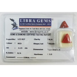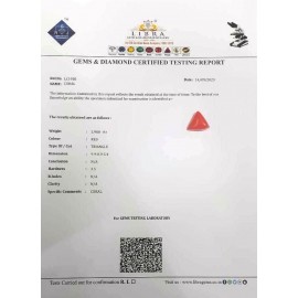 REPORT.NO.-LCI 827CLARITY.-N/ACOLOUR.-REDSHAPE/CUT.-TRIANGLEWT.-4.15 CTSDIMENSION.-1-1.10-8.5-5.R.INDEX.-N/AHARDNESS.35COMMENT.-CORAL..