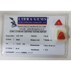 REPORT.NO.LCI 628CLARITY.N/ACOLOUR.REDSHAPE/CUT.TRIANGLEWT.3.83 CTSDIMENSION.1.4-10.8-5.3R.INDEX.N/AHARDNESS.3.5COMMENT.CORAL..