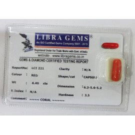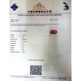REPORT NO . LCI 221CLARITY . N/ACOLOUR . REDSHAPE / CUT . CAPSULEWT . 4.40 CTSDIMENSION . 6-2.5-6.5-2.R . INDEX . N/AHARDNESS . 3.5COMMENT . CORAL..