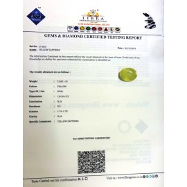 REPORT.NO.-LY 676CLARITY.-N/ACOLOUR.-YELLOWSHAPE/CUT.-OVALWT.-5.37 CTSDIMENSION.-10-6.9-6.4-8.R.INDEX.-1.76-1.78HARDNESS.-9.0COMMENT.-YELLOW SAPPHIRE..