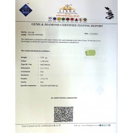 REPORT NO . LY 121CLARITY . N/ACOLOUR . YELLOWSHAPE / CUT . RECTANGLEWT . 3.36 CTSDIMENSION . 9-7.6-3.4-5.R . INDEX . 1.76-1.78HARDNESS . 9.0COMMENT . YELLOW SAPPHIRE..