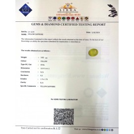 REPORT NO . LYA 10CLARITY . N/ACOLOUR . YELLOWSHAPE / CUT . OVALWT . 3.30 CTSDIMENSION . 9-2.6-6.5-7.R . INDEX . 1.76-1.78HARDNESS . 9.0COMMENT . YELLOW SAPPHIRE..