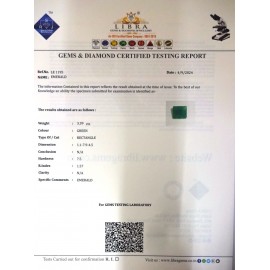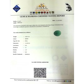 REPORT.NO.- LE 179CLARITY.- N/ACOLOUR.- GREENSHAPE/CUT.- OVALWT.- 3.63 CTSDIMENSION.- 1-8.9-7.4-6.R.INDEX.- 1.57HARDNESS.- 7.5COMMENT.- EMERALD..