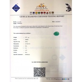 REPORT NO . LEJ 77CLARITY . N/ACOLOUR . GREENSHAPE / CUT . OVALWT . 5.24 CTSDIMENSION . 3-4.10-1.6-3.R . INDEX . 1.57HARDNESS . 7.5COMMENT . EMERALD { J }..