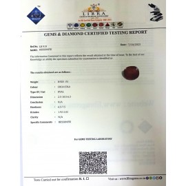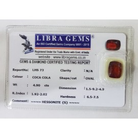 REPORT NO . LHS 73CLARITY . N/ACOLOUR . COCA COLASHAPE / CUT . OVALWT . 4.90 CTSDIMENSION . 1-5.9-2.4-9.R . INDEX . 1.92-2.02HARDNESS . 6.5-7.5COMMENT . HESSONITE { S }..