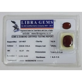 REPORT.NO.-LH 467CLARITY.-N/ACOLOUR.-COCA COLASHAPE/CUT.-OVALWT.-8.27 CTSDIMENSION.-3-6.1-5.5-8.R.INDEX.-1.92-2.02HARDNESS.-6.5-7.5COMMENT.-HESSONITE..