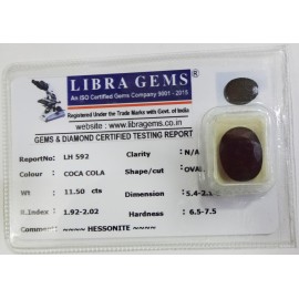 REPORT.NO.-LH 592CLARITY.-N/ACOLOUR.-COCA COLASHAPE/CUT.-OVALWT.-11.50 CTSDIMENSION.-5-4.2-1.6-5.R.INDEX.-1.92-2.02HARDNESS.-6.5-7.5COMMENT.-HESSONITE..