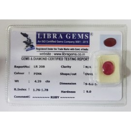REPORT NO . LR 208CLARITY . N/ACOLOUR . PINKSHAPE / CUT . OVALWT . 4.29 CTSDIMENSION . 9-6.8-1.5-4.R . INDEX . 1.76-1.78HARDNESS . 9.0COMMENT . RUBY..