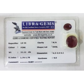REPORT NO . LR 56CLARITY . N/ACOLOUR . PINKSHAPE / CUT . OVALWT . 11.12 CTSDIMENSION . 4-3.3-5.5-1.R . INDEX . 1.76-1.76HARDNESS . 9.0COMMENT . RUBY..