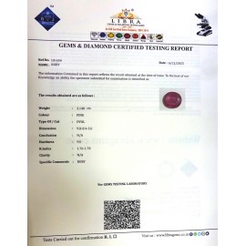 DATE: 17-3-2025REF.NO: LRM 126NAME: RUBYWEIGHT:  3.52 CTSCOLOUR: PINKTYPE OF/CUT: OVALDIMENSION:  10.1-7.1-4.6/CONCLUSION: N/AHARDNESS: 9.0R.INDEX: 1.76-1.78CLARITY: N/A ..
