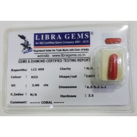 REPORT.NO.LCI 499CLARITY.N/ACOLOUR.REDSHAPE/CUT.CAPSULEWT.3.90 CTSDIMENSION.6.5-5.2-5.1R.INDEX.N/AHARDNESS.3.5COMMENT.CORAL..