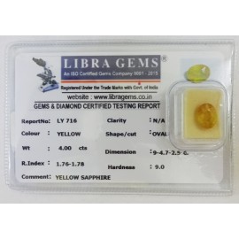 REPORT.NO.-LY 716CLARITY.-N/ACOLOUR.-YELLOWSHAPE/CUT.-OVALWT.-4.00 CTSDIMENSION.-9-4.7-2.5-6.R.INDEX.-1.76-1.78HARDNESS.-9.0COMMENT.-YELLOW SAPPHIRE..