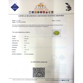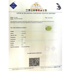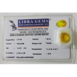 REPORT NO . LY 93CLARITY . N/ACOLOUR . YELLOWSHAPE / CUT . OVALWT . 5.13 CTSDIMENSION . 1-3.9-3.4-7.R . INDEX . 1.76-1.78HARDNESS . 9.0COMMENT . YELLOW SAPPHIRE..
