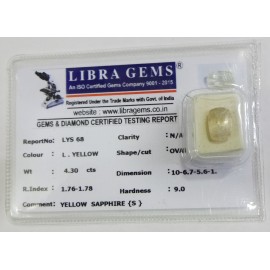 REPORT.NO.LYS 68CLARITY.N/ACOLOUR.L.YELLOWSHAPE/CUT.OVALWT.4.30 CTSDIMENSION.10.6-7.5-6.1R.INDEX.1.76-1.78HARDNESS.9.0COMMENT.YELLOW SAPPHIRE {S}..