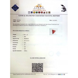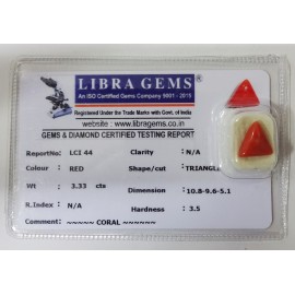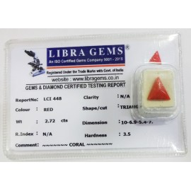 REPORT. NO. LCI 44CLARITY. N/ACOLOUR. REDSHAPE/CUT. TRIANGLEWT. 3.33 CTSDIMENSION. 10.8-9.6-5.1R. INDEX. N/AHARDNESS. 3.5COMMENT. CORAL ..