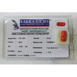 REPORT NO . LCI 194CLARITY . N/ACOLOUR . REDSHAPE / CUT . CAPSULEWT . 4.65 CTSDIMENSION . 4-3.6-8.5-3.R . INDEX . N/AHARDNESS . 3.5COMMENT . CORAL..