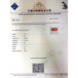 REPORT.NO.LCI 722CLARITY.N/ACOLOUR.REDSHAPE/CUT.CAPSULE WT.7.03 CTSDIMENSION.10.9-6.9-5.3R.INDEX.N/AHARDNESS.3.5COMMENT.CORAL..