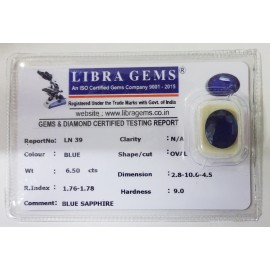 REPORT NO . LN 39CLARITY . N/ACOLOUR . BLUESHAPE / CUT . OVALWT . 6.50 CTSDIMENSION . 2-8.10-6.4-5.R . INDEX . 1.76-1.78HARDNESS . 9.0COMMENT . BLUE SAPPHIRE..