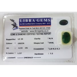 REPORT NO . LE 29CLARITY . N/ACOLOUR . GREENSHAPE / CUT . OVALWT . 4.32 CTSDIMENSION . 2-9.9-2.5-3.R . INDEX . 1.57HARDNESS . 7.5COMMENT . EMERALD..