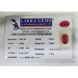 REPORT.NO.-LRA 78CLARITY.-N/ACOLOUR.-PINKSHAPE/CUT.-OVALWT.-4.86 CTSDIMENSION.-1.6-7.4-5.9R.INDEX.-1.76-1.78HARDNESS.-9.0COMMENT.-RUBY{A}..