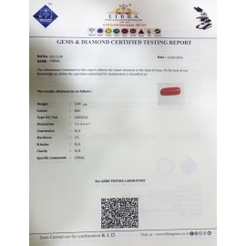 REPORT NO . LCI 230CLARITY . N/ACOLOUR . REDSHAPE / CUT . CAPSULEWT . 4.26 CTSDIMENSION . 8-7.5-2.5-1.R . INDEX . N/AHARDNESS . 3.5COMMENT . CORAL..