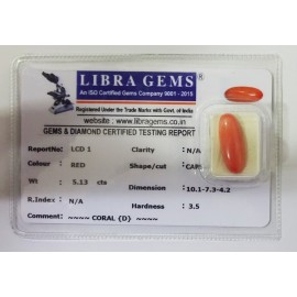 REPORT.NO.- LC 1CLARITY.- N/ACOLOUR.- REDSHAPE/CUT.- CAPSULEWT.-5.13 CTSDIMENSION.- 10.1-7.3-4.2R.INDEX.- N/AHARDNESS.- 3.5COMMENT.- CORAL {D}..
