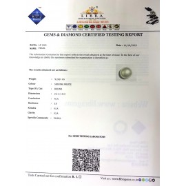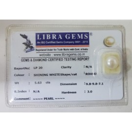 REPORT NO . LP 20CLARITY . N/ACOLOUR . SHINING WHITESHAPE / CUT . ROUNDWT . 5.63 CTSDIMENSION . 9-8.9-8.7-1.R . INDEX . N/AHARDNESS . 3.0COMMENT . PEARL..