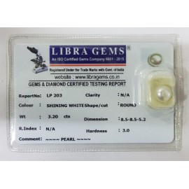 REPORT NO . LP 203CLARITY . N/ACOLOUR . SHINING WHITESHAPE / CUT . ROUNDWT . 3.20 CTSDIMENSION . 8-5.8-5.5-2.R . INDEX . N/AHARDNESS . 3.0COMMENT . PEARL..