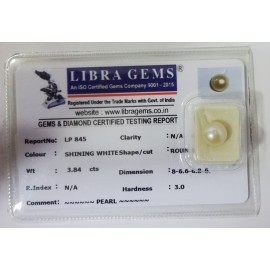 REPORT NO . LP 845CLARITY . N/ACOLOUR . SHINING WHITESHAPE / CUT . ROUNDWT . 3.84 CTSDIMENSION . 8-6.6-6.8-6.R . INDEX . N/AHARDNESS . 3.0COMMENT . PEARL..