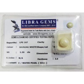 REPORT NO . LPS 167CLARITY . N/ACOLOUR . SHINING WHITESHAPE / CUT . ROUNDWT . 5.30 CTSDIMENSION . 8-9.8-8.8-9.R . INDEX . N/AHARDNESS . 3.0COMMENT . C / WATER PEARL { SOSI }..