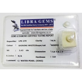REPORT.NO.-LPS 279CLARITY.-N/ACOLOUR.-SHINING WHITESHAPE/CUT.-ROUNDWT.-3.43 CTSDIMENSION.-7-8.7-8.7-9.R.INDEX.-N/AHARDNESS.-3.0COMMENT.-C / WATER PEARL { SOSI }..
