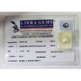 REPORT NO . LPSC 83CLARITY . N/ACOLOUR . SHINING WHITESHAPE / CUT . ROUNDWT . 4.31 CTSDIMENSION . 8-6.8-5.8-6.R . INDEX . N/AHARDNESS . 3.0COMMENT . PEARL { SOUTH SEA }..