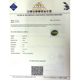 REPORT.NO.-LC 505CLARITY.-N/ACOLOUR.-GREENSHAPE/CUT.-OVALWT.-6.56 CTSDIMENSION.-1-8.10-5.7-8.R.INDEX.-1.54-1.55HARDNESS.-7.5COMMENT.-CATS EYE { S . QUARTZ ]..