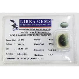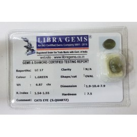 REPORT NO . LC 17CLARITY . N/ACOLOUR . L . GREENSHAPE / CUT . OVALWT . 6.87 CTSDIMENSION . 1-9.10-4.7-9.R . INDEX . 1.54-1.55HARDNESS . 7.5COMMENT . CATS EYE { S . QUARTZ }..
