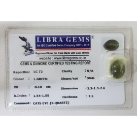 REPORT NO . LC 72CLARITY . N/ACOLOUR . L . GREENSHAPE / CUT . OVALWT . 8.10 CTSDIMENSION . 3-3.1-3.7-6.R . INDEX . 1.54-1.55HARDNESS . 7.5COMMENT . CATS EYE { S . QUARTZ }..
