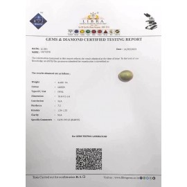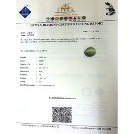 REPORT.NO.LC 747CLARITY.N/ACOLOUR.GREEN SHAPE/CUT.OVAL WT.5.25 CTS DIMENSION.2.1-10.1-6.5R.INDEX.1.54-1.55HARDNESS.7.5COMMENT.CATS EYE {S.QUATRZ}..