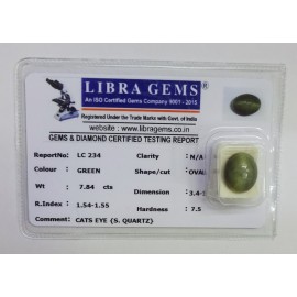 REPORT NO . LC 234CLARITY . N/ACOLOUR . GREENSHAPE / CUT . OVALWT . 7.84 CTSDIMENSION . 3-4.1-2.6-9.R . INDEX . 1.54-1.55HARDNESS . 7.5COMMENT . CATS EYE { S . QUARTZ }..