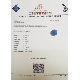 DATE:1-7-2024REF.NO:LN 1234NAME:BLUE SAPPHIREWEIGHT:8.54 CTSCOLOUR:BLUETYPE OF/CUT:OVALDIMENSION:1.8-10.1-8.1CONCLUSION:N/AHARDNESS:9.0R.INDEX:1.76-1.78CLARITY:N/ASPECIFIC COMMENTS:BLUE SAPP..