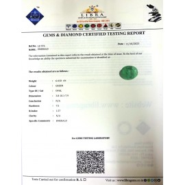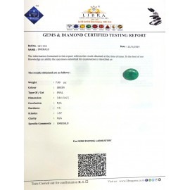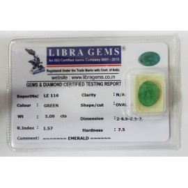 REPORT NO . LE 116CLARITY . N/ACOLOUR . GREENSHAPE / CUT . OVALWT . 5.09 CTSDIMENSION . 2-6.9-9.5-2.R . INDEX . 1.57HARDNESS . 7.5COMMENT . EMERALD..