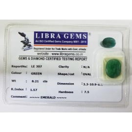 REPORT.NO.-LE 307CLARITY.-N/ACOLOUR.-GREENSHAPE/CUT.-OVALWT.-8.21 CTSDIMENSION.-3.3-10.9-8.5R.INDEX.-1.57HARDNESS.-7.5COMMENT.-EMERALD..