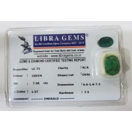 REPORT NO . LE 72CLARITY . N/ACOLOUR . GREENSHAPE / CUT . OVALWT . 7.68 CTSDIMENSION . 4-6.1-6.7-3.R . INDEX . 1.57HARDNESS . 7.5COMMENT . EMERALD..