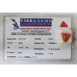 REPORT NO . LCI 143CLARITY . N/ACOLOUR . REDSHAPE / CUT . TRIANGLEWT . 5.18 CTSDIMENSION . 10-8.10-4.6-5.R . INDEX . N/AHARDNESS . 3.5COMMENT . CORAL..