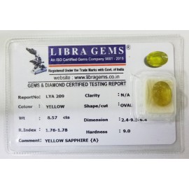 REPORT.NO.-LYA 209CLARITY.-N/ACOLOUR.-YELLOWSHAPE/CUT.-OVALWT.-8.57 CTSDIMENSION.-2-4.9-5.6-4.R.INDEX.-1.76-1.78HARDNESS.-9.0COMMENT.-YELLOW SAPPHIRE { A }..