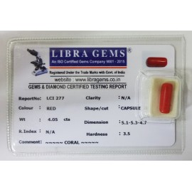 REPORT NO . LCI 277CLARITY . N/ACOLOUR . REDSHAPE / CUT . CAPSULEWT . 4.05 CTSDIMENSION . 5-1.5-3.4-7.R . INDEX . N/AHARDNESS . 3.5COMMENT . CORAL..