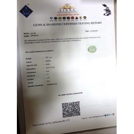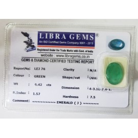 REPORT NO . LEJ 76CLARITY . N/ACOLOUR . GREENSHAPE / CUT . OVALWT . 6.42 CTSDIMENSION . 4-3.10-7.6-1.R . INDEX .1.57HARDNESS . 7.5COMMENT . EMERALD { J }..