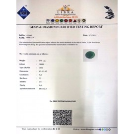 REPORT NO . LE 1CLARITY . N/ACOLOUR . GREENSHAPE / CUT . OVALWT . 3.51 CTSDIMENSION . 10-7.8-7.8-1.R . INDEX . 1.57HARDNESS . 7.5COMMENT . EMERALD..