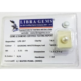 REPORT.NO.-LPS 297CLARITY.-N/ACOLOUR.-SHINING WHITESHAPE/CUT.-ROUNDWT.-3.51 CTSDIMENSION.-7-7.7-7.7-8.R.INDEX.-N/AHARDNESS.-3.0COMMENT.-C / WATER PEARL { SOSI }..